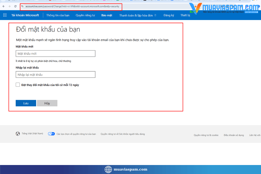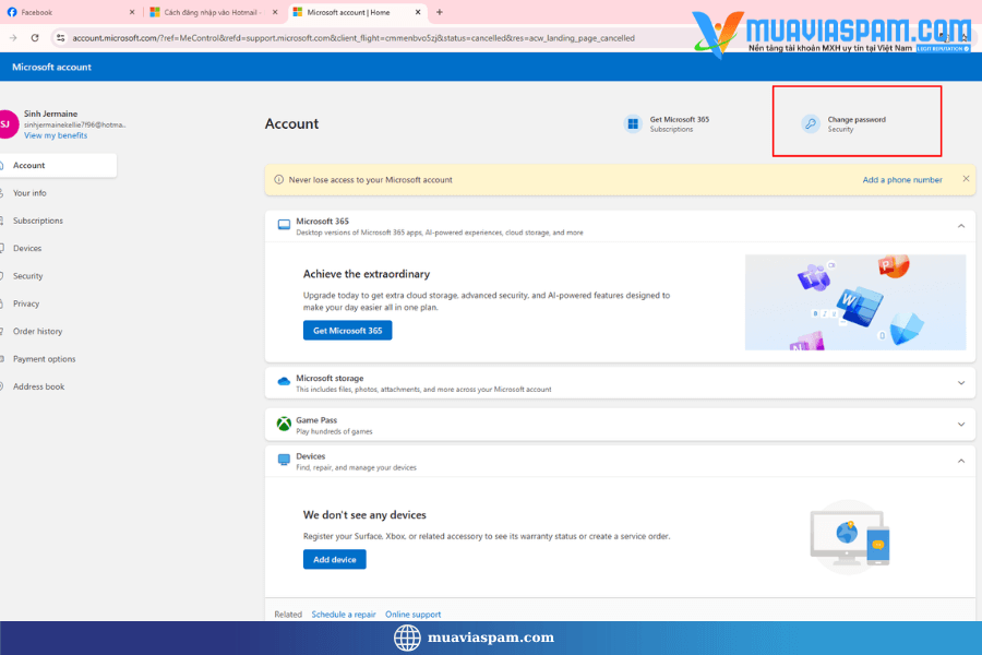 Khi đã đăng nhập hotmail của via bằng trình duyệt nhớ thêm mail khôi phục tránh bị khóa hotmail (Quan trọng: add mail khôi phục getnada, vào đây để tạo mail khôi phục https://inboxes.com/ TRÁNH TRƯỜNG HỢP sau này sẽ không mở được hotmail và không đổi mật khẩu mail được ) tiến hành đổi mật khẩu hotmail.